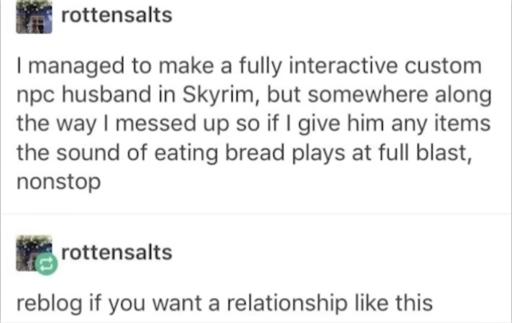 Twongo [she/her]@lemmy.ml · 16 hours agoSkyrim Husband Rulelemmy.mlimagemessage-square0linkfedilinkarrow-up1156arrow-down11