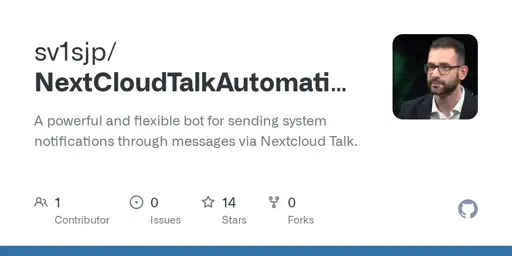 sv1sjp@lemmy.worldEnglish · 1 year agoNextCloudTalkAutomationBot: A powerful and flexible bot for sending system notifications through messages via Nextcloud Talk.plus-squaregithub.comexternal-linkmessage-square0linkfedilinkarrow-up11arrow-down10