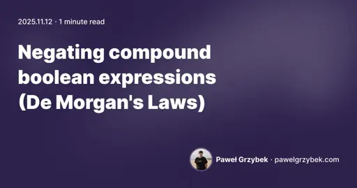 arrow-up120arrow-down1external-linkNegating compound boolean expressions (De Morgan's Laws)plus-squarepawelgrzybek.comcodeinabox@programming.devEnglish · 1 day agomessage-square2linkfedilink