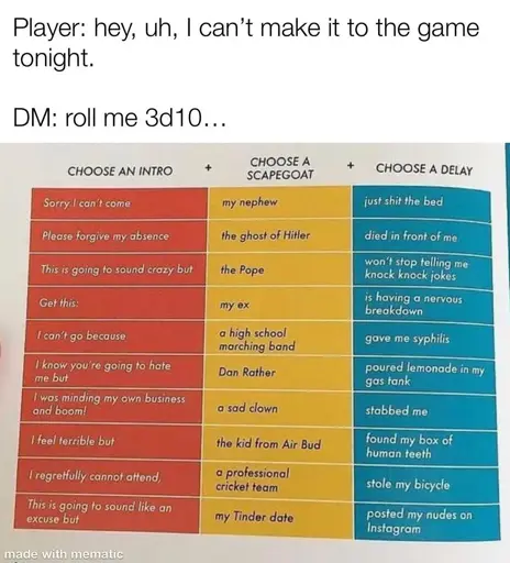 Dazharion@lemmy.dbzer0.com · 1 day agoCan't make it? Finelemmy.dbzer0.comimagemessage-square30linkfedilinkarrow-up1285arrow-down12