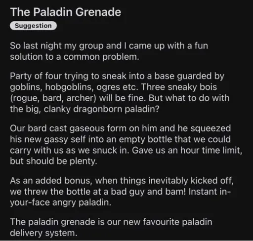Stamets@lemmy.dbzer0.com · 8 days agoThe Paladin Grenadelemmy.dbzer0.comimagemessage-square17linkfedilinkarrow-up1447arrow-down12