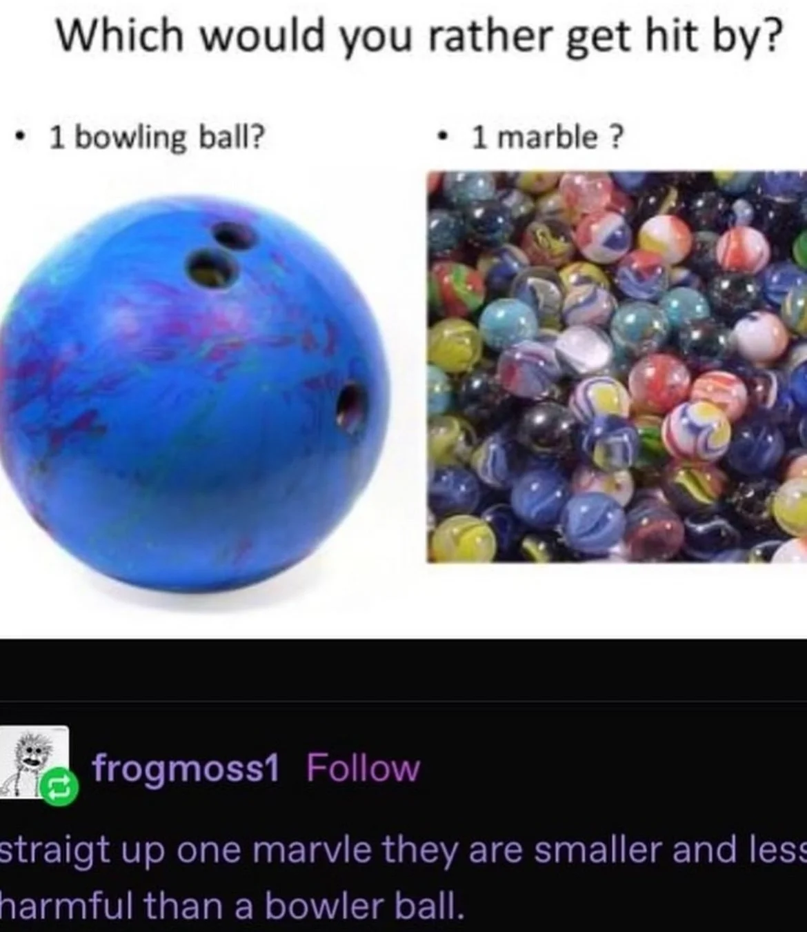 Air resistance will affect the marble more since it’s traveling faster. I also feel like either mass (or more likely, density) of the object matters, which would advantage the bowling ball in this aspect too.
