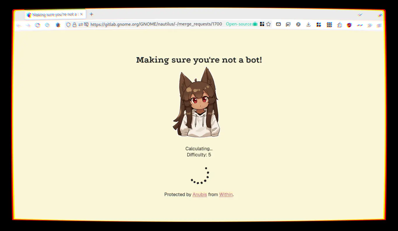 The solution the eventually settled to was switching to Anubis. This is a page that presents a challenge to the browser, which then has to spend time doing some math and presenting the solution back to the server. If it’s right, you get access to the website.