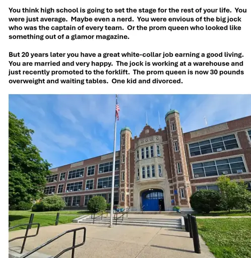 Does somebody else’s lack of success really please you? Who is to say that operating a forklift or waiting tables can’t be a fulfilling job for those people? Why should it please you for people that were popular in high school to find themselves with less career success? If you were to say they were horrible people then maybe I’d understand it, but this just comes off as a lack of self-satisfaction such that you feel you must inflate yourself by deflating others. Not cool.
