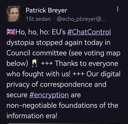 Chatcontrol is once again stopped. Good work again everyone who stood up, this is once again a win everytime it is a win.