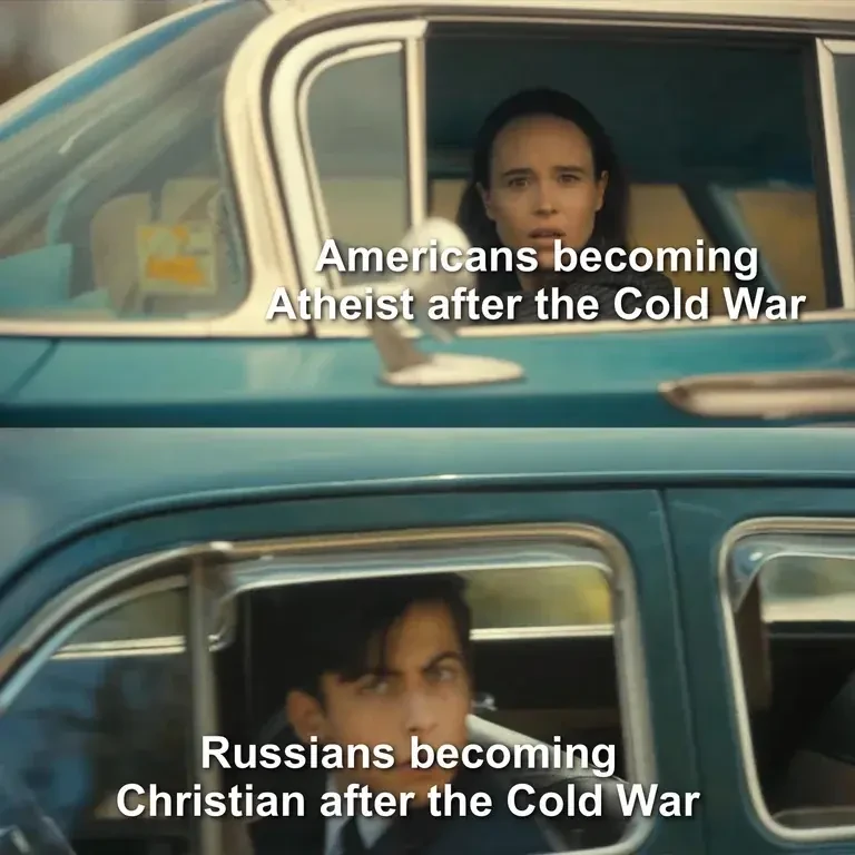Explanation: The US during the Cold War leaned into Christianity as a means of differentiating ourselves from the ‘godless commies’. The Soviet Union supported state atheism as a means of stamping out superstition. After the Cold War ended, the trends reversed, with atheism surging in the US, and Christianity seeing a revival in Russia.
