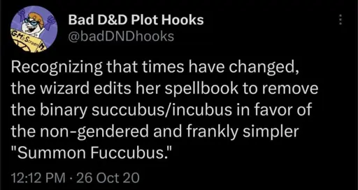 PugJesus@piefed.social to RPGMemes @ttrpg.networkEnglish · 24 days agoNot to be confused with "Summon Funkubus"media.piefed.socialimagemessage-square15linkfedilinkarrow-up1411arrow-down112