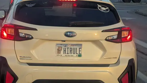Description: rear of hatchback with window decals depicting symbols from the Zelda video game series and a custom license plate reading HIRULE.