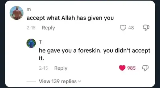 minus-squaretoothpaste_sandwich@thebrainbin.orglinkfedilinkarrow-up0·4 days agoI didn’t know Muslims circumcised too!