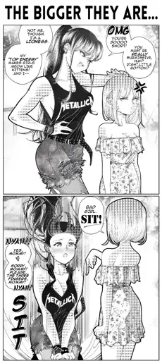 Alt text: a tall, long-haired gal with a Metallica shirt and ripped jeans/leggings. She pats a blonde short gal in a flower dress. She says: “Oh my god, you are so short! You must be really submissive, huh? Right, little bottom? Not me, though, I’m a lioness. My “top energy” makes girls meow like little kittens. And I-” and gets interrupted in the next panel by the short girl pointing to her saying: “Bad girl, sit!”.