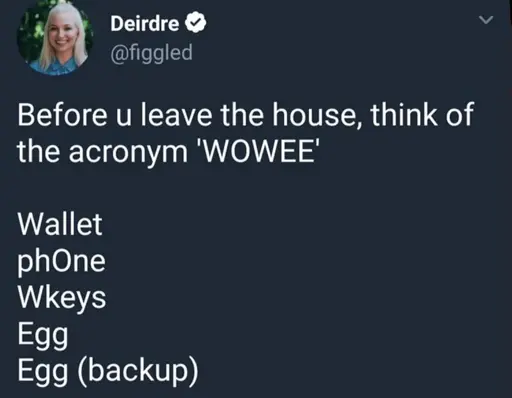 Phone, Wallet, Whistle, Egg, Egg, Keys