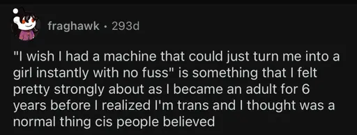 For way too long I thought “I don’t understand why everyone gets so bent out of shape about trans people. Being a girl is clearly so much better, trans women are just the lucky ones who get to transition. It’s just a shame that I’m not trans, so I can’t transition and be a girl”