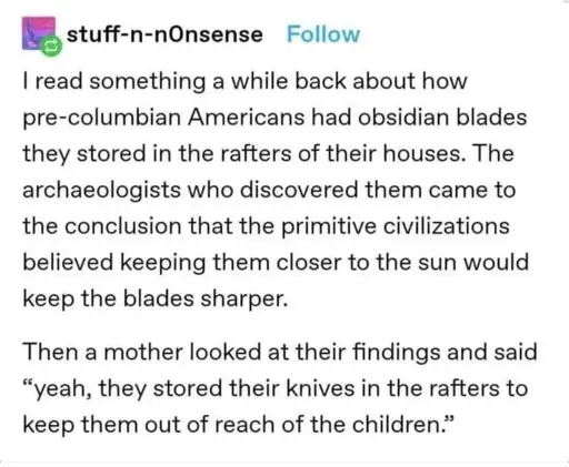 Couldn’t find anything to validate this specific claim of archeologists claiming obsidian blades were kept close to the sun (under a roof???) to keep them sharp, but you see things like this pop up from time to time, wherein specialists or people from the region point out that a poorly-understood archeological find is just a specialist tool or regional practice that’s still in use.