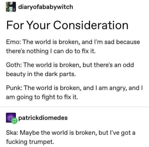 Nu metal is bipolar. Its either “the world is broken but ignore it with the help of a song that has no right to be this groovy” or “the world is broken and thats why im setting the whole fucking place on fire including myself”