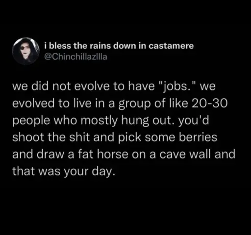 Given the choice between the two, I’d live the hunter gatherer lifestyle rather than working 50+ hours a week as a wage slave to barely keep my head above water. And I know that’s not all daisies and rainbows either, but fuck capitalism and this construct we’re currently living in.