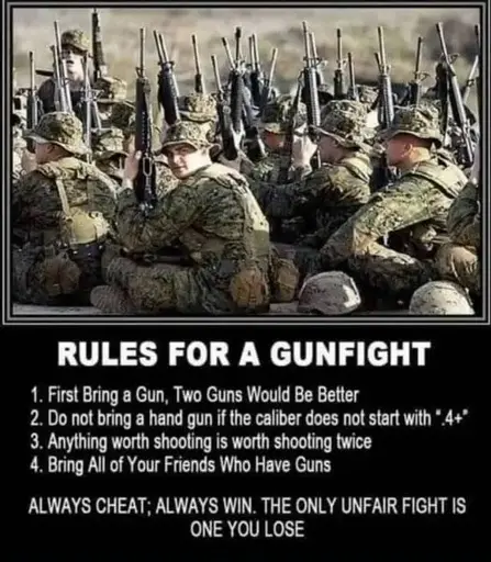 Sine_Fine_Belli@lemmy.worldM to Dank memes for Liberal gun owners@lemmy.worldEnglish · 30 days agoRules for a gun fightlemmy.worldimagemessage-square0linkfedilinkarrow-up11arrow-down10 cross-posted to: noncredibledefense@sh.itjust.workslemmyshitpost@lemmy.world