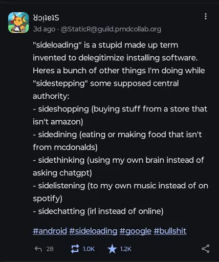 I’m not sideloading an app onto my desktop when I download an appx file from GitHub to install something instead of using the windows store, having a special term for installing an apk file outside the play store just obscures what’s happening