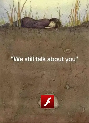 A drawing of a person laying on the ground, seen from the side. There is text on the image, “We still talk about you”. Deep in the ground, there is the Adobe Flash logo.