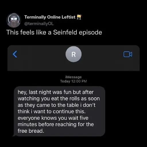 minus-squarethesohoriots@lemmy.worldlinkfedilinkEnglisharrow-up14·8 days ago“We have a rule, if you order the nachos to share, one person can’t just eat all the fully loaded nachos.”