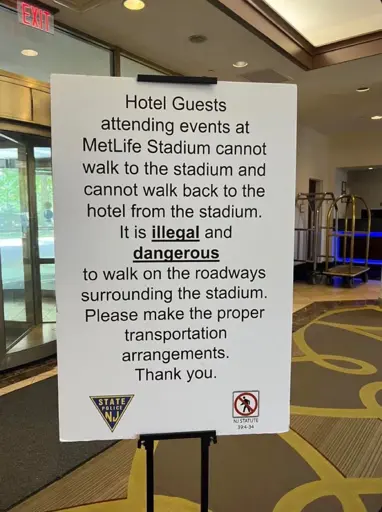 No, it’s not a lie. You literally cannot walk from where this sign is posted to MetLife Stadium while obeying New Jersey traffic laws. And I don’t mean some ad hoc one either; I mean e.g. ones about not playing Frogger across 10 lanes of highway traffic.