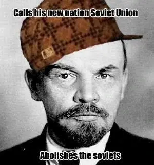 Explanation: After the October Revolution, the Bolshevik faction took power in a coup from the Russian provisional government organizing elections. One of their many slogans was “All power to the Soviets!”, the Soviets being the local democratic workers’ councils.