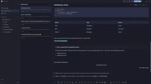 Obsidian’s default editor is barebones, you need plugins to get a usable experience. HelixNotes gives you rich editing out of the box: formatting toolbar, slash commands, source mode toggle. No setup. It’s also not Electron. Rust + Tauri 2.0 & Svelte fraction of the RAM, launches instantly. Same philosophy though: local .md files, no cloud, no lock-in. If Obsidian works for you, no reason to switch.
