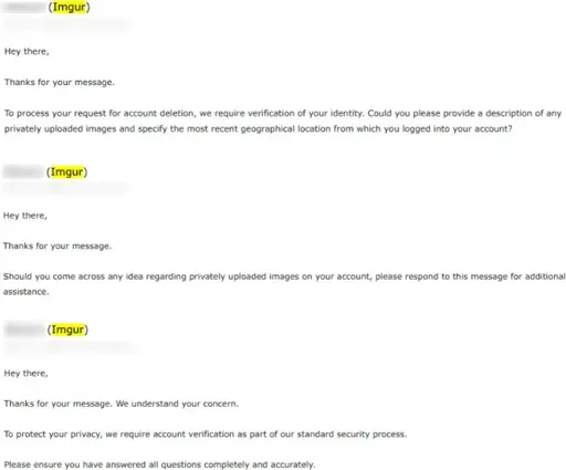 I made a real effort to answer, giving my best guesses for both, but their responses were consistently passive-aggressive, as if I was the one being unreasonable! And all that friction just for them to delete my email address and a couple of images that I may or may not have uploaded to Imgur over the last 10 years.