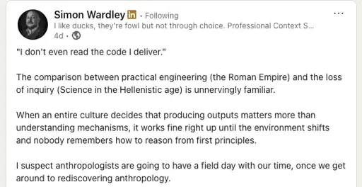 Jacob is right that AI is changing the way that normal software development work gets done. It’s a new capability that has proven itself to be so useful that it clearly isn’t going away. Yes, it represents a significant shift in how we build software, it moves us further away from how the underlying stuff actually works, but the benefits exceed the risks.