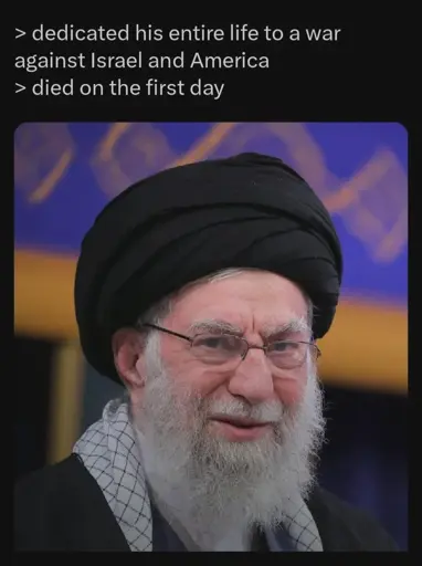 What does being happy that Khamenei (and his adult family members who benefited from the regime) being killed have to do with supporting Israel and the US? I explained my issue with Khamenei, did I not?