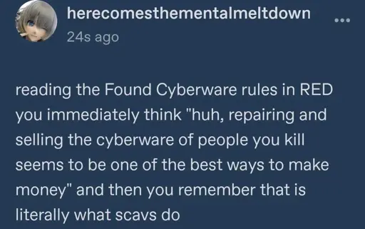 I prefer systems where social skills are first class mechanics, I don’t love offloading part of progression onto loot, and I don’t particularly enjoy the gold economy. Like I don’t enjoy tracking wealth and rations and such. I also prefer systems that attempt to recreate the narrative arcs of stories, so things that affect pacing, drama, contacting the flow of the story to character flaws, etc.