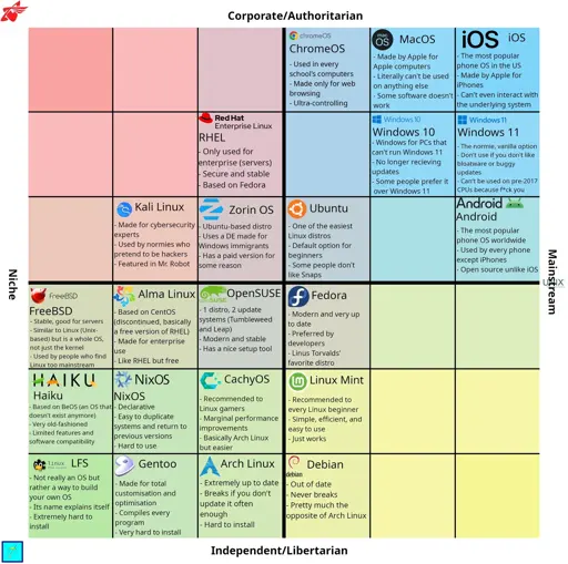 Android below red hat in corporate/authoritarian and equal to Ubuntu 😂 the OS that is trying to take away installing apps not from them and trying to fully track app developers while not giving a damn about malware that effects the user because it doesn’t effect their bottom line?