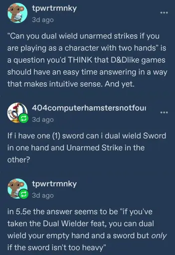 tgirlschierke@lemmy.blahaj.zone to RPGMemes @ttrpg.networkEnglish · 7 days agoDual Wielding [Dungeons & Dragons]lemmy.blahaj.zoneimagemessage-square89linkfedilinkarrow-up1474arrow-down15