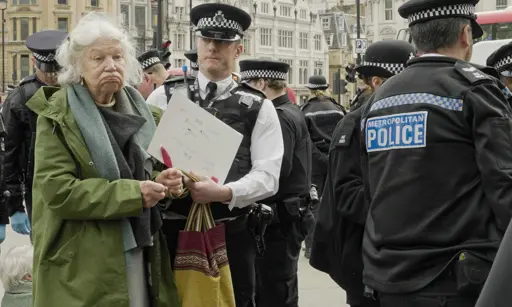Some 500 protesters set up camping chairs at the foot of the steps of Trafalgar Square, displaying handmade cardboard signs reading: “I oppose genocide, I support Palestine Action.”