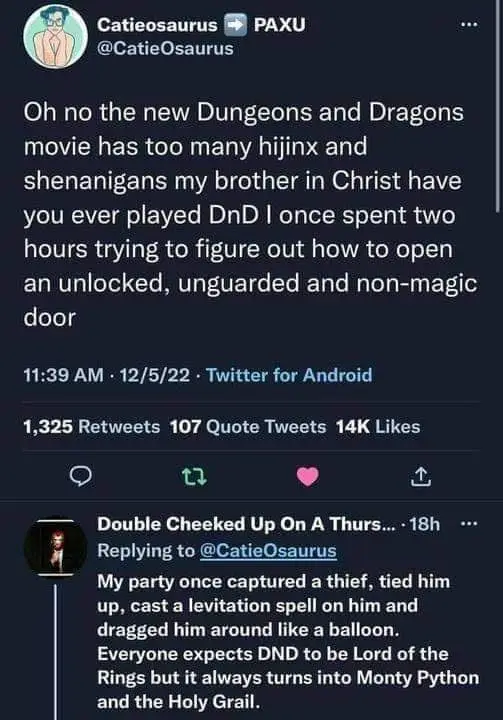 • A streamer I watch mentioned how they played D&D and it wasn’t all super horny like all the D&D memes he finds and I just had to wonder what weird D&D group he played with that there wasn’t at least 1 person playing a Bard whose entire schtick was fucking their way out of every problem?